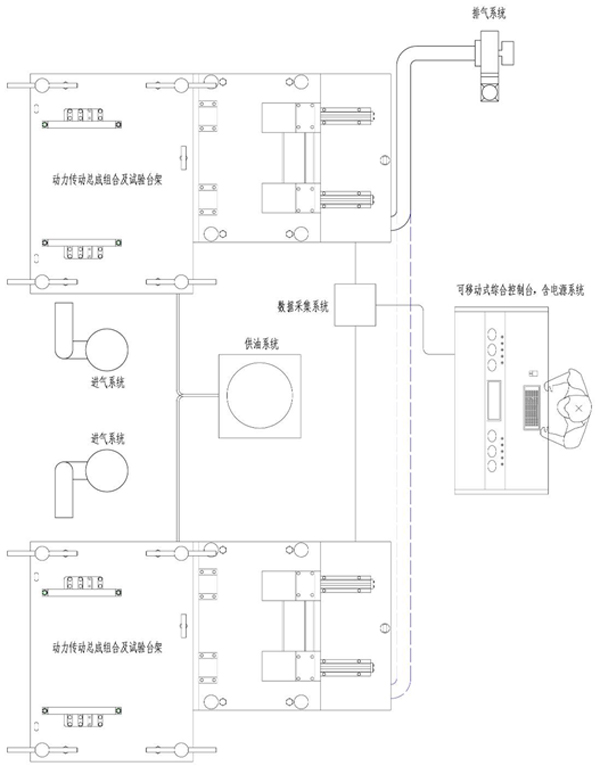 動力傳動組合試驗系統布置方案如圖所示: